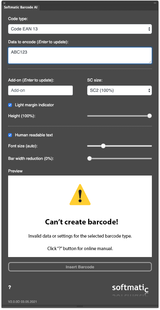 Current version: V2.4.0 System requirements: macOS 10.15 or higher Windows 10 or higher Adobe Illustrator CC 2021 (Version 25) or higher Supported barcode symbologies: ● EAN 8 ● EAN 13 (with optional add-on) ● ISBN 10 (with optional add-on for price) ● ISBN 13 (with optional add-on for price) ● ISSN (with optional add-on) ● UPC-A (with optional add-on) ● UPC-E ● Code 128 A, B, C ● Code 128 GS1 ● Code 2/5 Interleaved ● Code 2/5 Industrial ● Code ITF-14 ● Code 39 / 39 Extended ● PZN 7 / PZN 8 ● Laetus ● Codabar ● Datamatrix (2D) ● Datamatrix GS1 (2D) ● PDF 417 (2D) ● QR (2D) ● Aztec (2D) Note: EAN 13 is referred to by many other names, e.g. JAN, EAN 99, EAN Velocity, etc.. All those codes are ordinary EAN 13. InstallationPurchase through Adobe ExchangeLocate the extension on the Creative Cloud Marketplace. After purchasing, the extension will automatically be downloaded and installed in your local extensions folder. Close Illustrator before installing. After installation, reopen Illustrator. The extension can be found in Illustrator menu bar > Window > Extensions. If the automatic install fails, you can anytime install manually: In the Creative Cloud app navigate to Stock & Marketplace > Plugins > Manage Plugins. The extension should be listed in this panel. Close Illustrator and then click the "Install" button next to the listing. After installation, reopen Illustrator. Note that the extension is tied to the Adobe ID that was used for downloading. Purchase through the Softmatic Online StoreFollow the instructions here for installation; on first launch the extension will prompt you for the license key which you should have received after checkout in the store. Default settings![]() With the first launch of the extension, the following settings are used: Code type: EAN 13 EAN Size: SC2 Data to encode: 401234567890 Add-on: None Light margin indicator: Yes Human readable text: Yes Height: 100% Bar width reduction: 0% Choose barcode typeChoose the desired barcode type from the list of available codes.Note that the settings panel changes with the selected code; in the left screen, the extension shows settings that apply to Code EAN 13 (e.g. SC size or margin indicator); in the right screen, settings for Code 128 are displayed (module width and - height): ![]() If you choose a code type that is incompatible with the given data, an error message is displayed. An example with invalid data ("ABC123") for EAN 13: