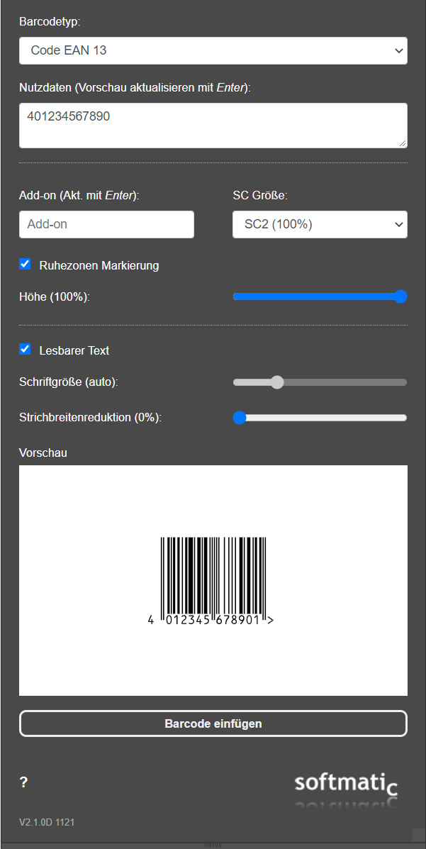 Softmatic Barcode Extension für Adobe IllustratorEinfachste Barcoderstellung direkt in Ihrem Illustrator Dokument. Die Softmatic Barcode Extension für Adobe Illustrator 2021 oder höher erzeugt alle gängigen Barcodes für Handel, Warenwirtschaft und Logistik. Wir garantieren, daß die erzeugten Barcodes den entsprechenden Normen der EAN/GS1 und der ISO entsprechen.Die Barcodes können in weiten Grenzen konfiguriert werden: Größe, lesbarer Text, Strichbreitenreduktion zum Ausgleich von Druckzuwachs - alles ist möglich. Die Extension nimmt Prüfziffernberechnungen und Datenaufbereitung automatisch im Hintergund vor - keine Programmierung oder Makros notwendig. Die Softmatic Barcode Extension funktioniert ohne externe Abhängigkeiten, also auch ohne Onlineverbindung und ohne externe Programme oder Barcodeschriftarten. Illustrator Dokumente mit Barcodes haben keinerlei Abhängigkeiten und können problemlos weitergegeben und geteilt werden.
