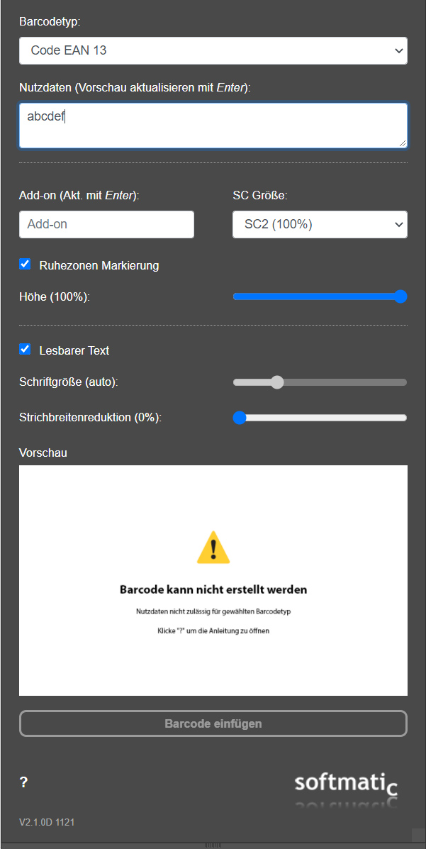 InstallationBezug von der Adobe ExchangeNach dem Kauf auf dem Creative Cloud Marketplace wird die Extension automatisch heruntergeladen und installiert. Schließen Sie zuvor Illustrator. Danach starten Sie Illustrator wieder. Die Erweiterung finden Sie dann im Menü Fenster > Erweiterungen. Bezug über den Softmatic Online StoreZur Installation folgen Sie den Anweisungen hier. Beim ersten Aufruf der Extension wird der Lizenzschlüssel abgefragt; Sie sollten diesen nach dem Kauf im Store per Email erhalten haben. Voreinstellungen![]() Beim Aufruf werden die folgenden Standardeinstellungen verwendet: Codetyp: EAN 13 Nutzdaten: 401234567890 EAN Codegröße: SC 2 EAN Höhe: 100% Ruhezonen Markierung: Ja Lesbarer Text: Ja Strichbreitenreduktion: 0% Barcodetyp wählenWählen Sie den gewünschten Barcodetyp aus der Liste verfügbarer Codes.Beachten Sie, daß die Optionen zur Coderstellung mit der jeweiligen Type variieren. Im linken Bild mit EAN werden EAN-spezifische Optionen angeboten (EAN Größe, Ruhezonenmarkierung usw.). Im rechten Bild mit Code 128 statt dessen Modulbreite- und höhe. ![]() Wenn der gewählte Codetyp inkompatibel mit den eingegebenen Nutzdaten ist, wird eine entsprechende Fehlermeldung angezeigt. Im Beispiel ungültige Daten ("abcdef") für Code EAN 13: ![]() Eingabe der NutzdatenNach Auswahl des gewünschten Codetyps geben Sie die Nutzdaten ein und wählen die für den Codetyp verfügbaren Einstellungen: