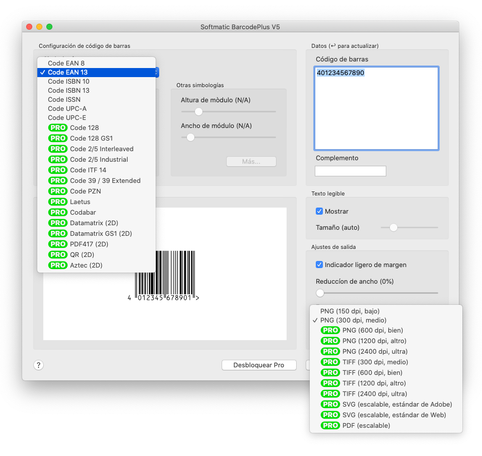 Se encuentran muchas más simbologías de códigos de barras y exportaciones de mayor resolución, así como exportaciones en formatos vectoriales.