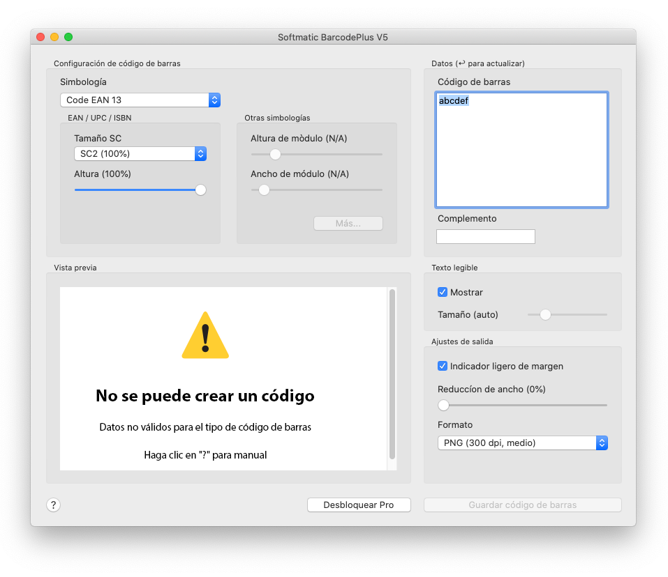 Si elige un tipo de código que es incompatible con los datos proporcionados, se muestra un mensaje de error. Un ejemplo con datos no válidos ("abcdef") para EAN 13: