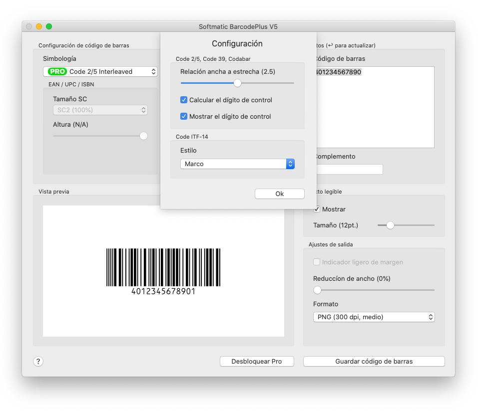 Código 2/5, ITF-14, Código 39, PZN, Codabar: