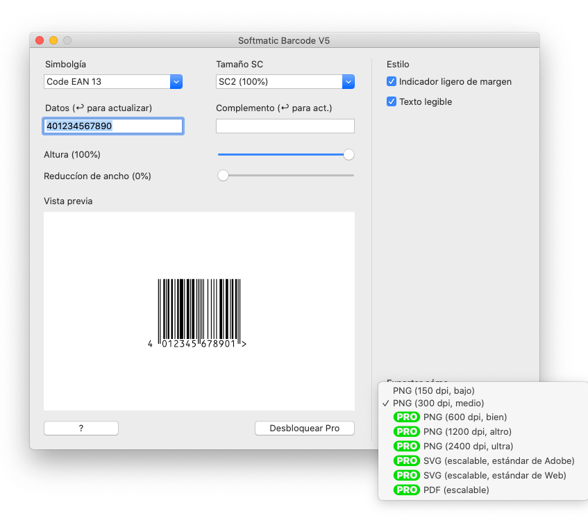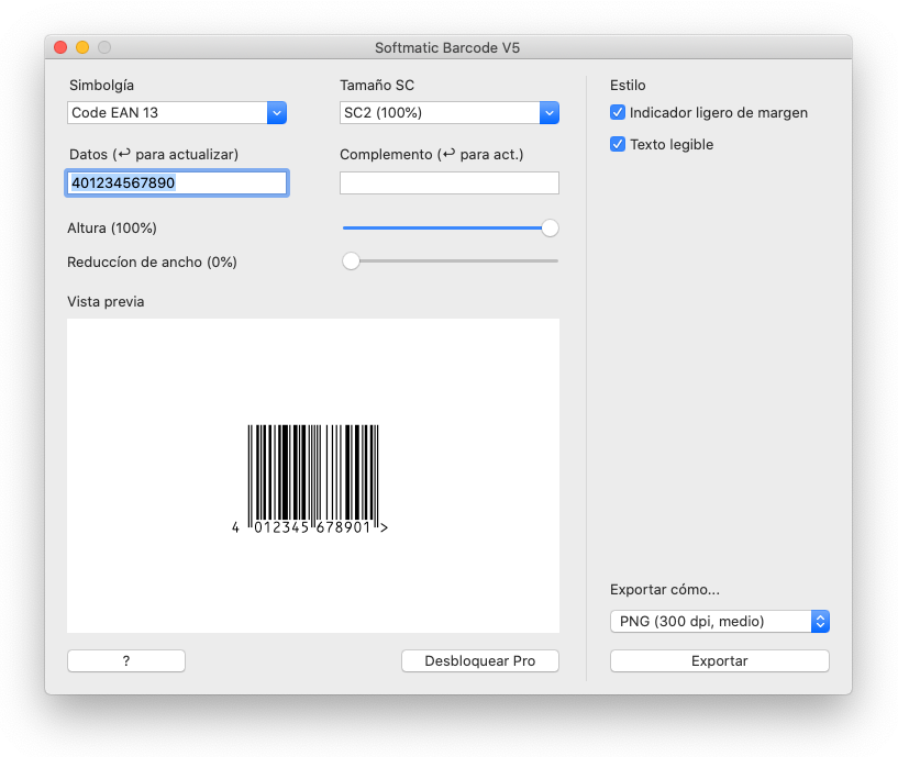 Las funciones Pro están disponibles mediante una suscripción. Para suscribirse, haga clic en el botón Desbloquear Pro y siga las instrucciones en su pantalla. Además, la suscripción le da derecho a soporte premium gratuito por correo electrónico con un tiempo de respuesta garantizado de un día hábil y actualizaciones gratuitas durante la vida útil del software. Se aplican nuestras condiciones de servicio y la política de privacidad. Para obtener una colección de muestras de códigos de barras vectoriales y de alta resolución, consulte este archivo. Los ajustes por defectoCuando se ejecute el software por primera vez, se utilizarán los siguientes ajustes:Tipo de código: EAN 13 Tamaño de EAN: SC 2 Altura EAN: 100% Datos a codificar: 401234567890 Cuadro de delimitación: Sí Texto legible: Sí Reducción de ancho de barra: 0% La ventana del extensíon al ejecutar por primera vez: