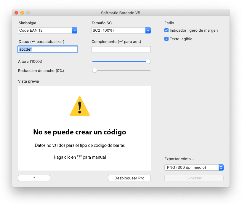 InstalaciónModo básico vs modo ProDespués de la descarga, la aplicación se ejecuta en modo Básico. En el modo Básico, la exportación está restringida a imágenes rasterizadas con una resolución de impresión máxima de 300 ppp, que es suficiente para muchos casos de uso. Los tipos de código admitidos en el modo Básico son los códigos comerciales comunes EAN, ISBN, UPC, etc. Se encuentran muchas más simbologías de códigos de barras y exportaciones de mayor resolución, así como exportaciones en formatos vectoriales. disponible en el modo Pro.Las funciones Pro están indicadas por la insignia verde, que se muestra aquí antes de desbloquear: