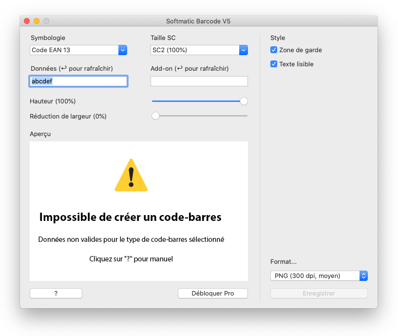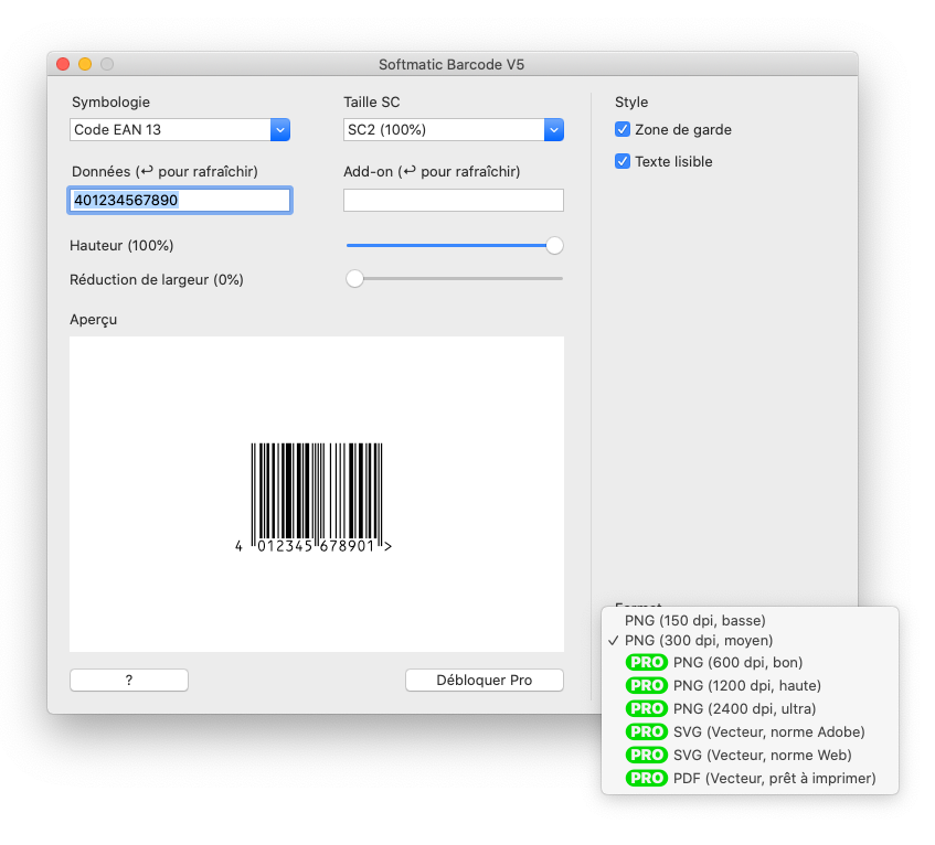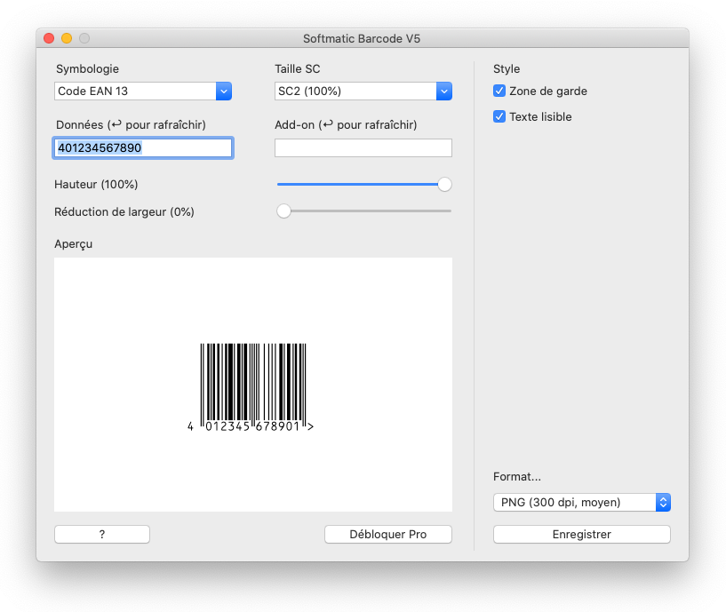 Les fonctionnalités Pro sont disponibles via un abonnement. Pour vous abonner, cliquez sur le bouton Débloquer Pro et suivez les instructions à l'écran. De plus, l'abonnement vous donne droit à une assistance par e-mail premium gratuite avec un temps de réponse garanti d'un jour ouvrable et des mises à jour gratuites pendant toute la durée de vie du logiciel. Nos conditions d'utilisation et politique de confidentialité s'appliquent. Les paramètres par défautAu premier lancement du logiciel, les réglages suivants sont utilisés:Type de code : EAN 13 EAN taille : SC 2 EAN hauteur : 100% Données à encoder : 401234567890 Zone de garde : Oui Texte lisible : Oui Réduction de largeur de barres: 0% La fenêtre du programme au premier lancement:
