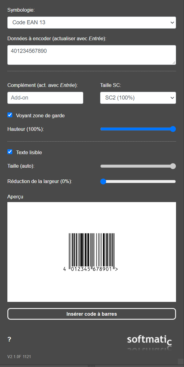 Pour actualiser la prévisualisation, tapez <Entrée> une fois les données entrées. Remarque: Pouré prévenir les erreurs de frappe, le logiciel recalculera toujours le chiffre de contrôle correspondant au code sélectionné. Par exemple, si vous utilisez EAN 13, peu importe que vous entriez 12 ou 13 chiffres. Si c'est 12, le logiciel leur affectera le chiffre de contrôle. Si c'est 13, le logiciel écrasera le dernier chiffre avec le chiffre de contrôle. Options de texteL'extension est livrée avec une police compatible OCR-B intégrée. Le texte sous le code peut être configuré avec ces options :