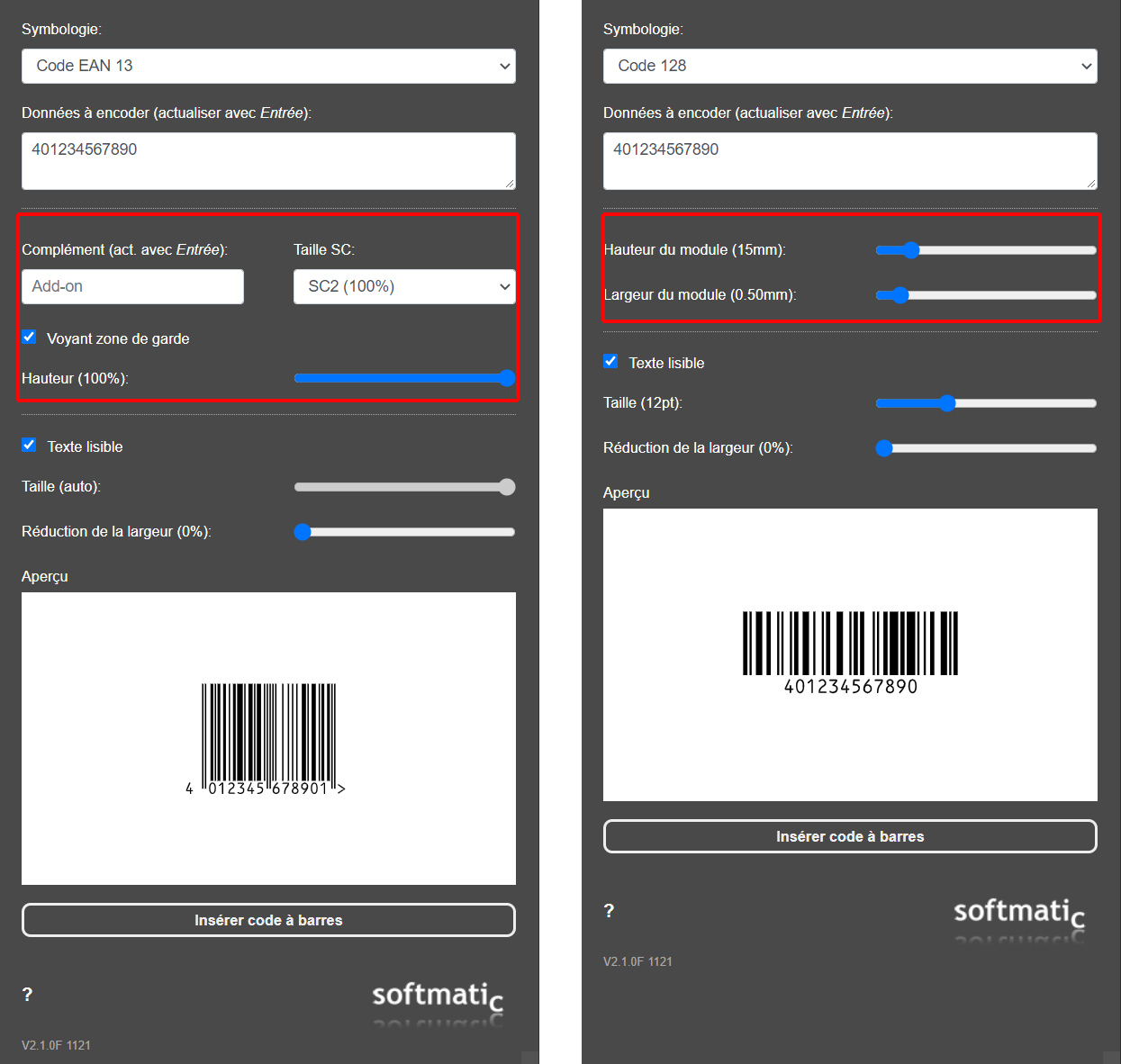 Saisissez les données à encoder et définissez les options de code-barresAprès avoir choisi le type de code-barres, saisissez les données à encoder et effectuez les réglages appropriés :