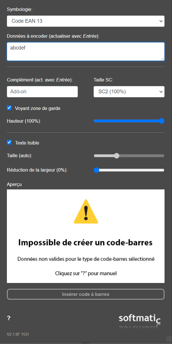 InstallationAchat sur l'Adobe ExchangeAprès l'achat via le Creative Cloud Marketplace, l'extension sera automatiquement installée dans votre dossier d'extensions local. Fermez InDesign avant l'installation. Après l'installation, rouvrez InDesign. L'extension se trouve dans la barre de menus InDesign > Fenêtre > Extensions. Achat sur la boutique en ligne SoftmaticSuivez les instructions ici pour l'installation ; lors du premier lancement, l'extension vous demandera la clé de licence que vous auriez dû recevoir après le paiement dans le magasin. Les paramètres par défautAu premier lancement du logiciel, les réglages suivants sont utilisés:Type de code : EAN 13 EAN taille : SC 2 EAN hauteur : 100% Données à encoder : 401234567890 Zone de garde : Oui Texte lisible : Oui Réduction de largeur de barres: 0% La fenêtre du programme au premier lancement: ![]() Sélectionnez le type de code-barresChoisissez le type de code-barres souhaité dans la liste des codes disponibles.Notez que le panneau des paramètres change avec le code sélectionné ; dans l'écran de gauche, l'extension affiche les paramètres qui s'appliquent au code EAN 13 (par exemple, taille SC ou indicateur zone de garde) ; dans l'écran de droite, les paramètres du Code 128 sont affichés (largeur et - hauteur du module) : ![]() Si vous choisissez un type de code incompatible avec les données fournies, un message d'erreur s'affiche. Un exemple avec des données invalides ("abcdef") pour EAN 13 :